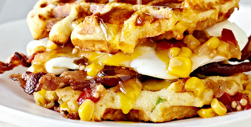 The best Breakfast Sandwich you could ask for. Crispy Bacon and egg sandwiched between our homemade buttermilk waffles